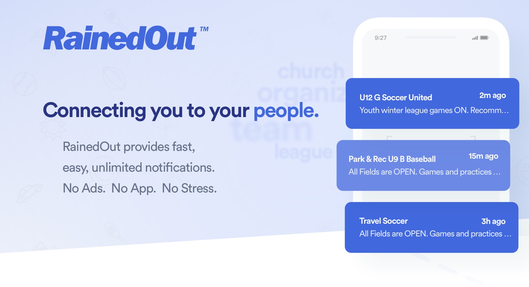 The receiver of the messages can choose to either receive emails or text messages. If they choose to receive emails, then these are free. If they choose to receive unlimited text messages - then we would charge them $7.30 per year for unlimited messaging from unlimited RainedOut accounts. You would send the messages as you do today. The organization can also pay for unlimited messages at the same rate of $7.30 per person.